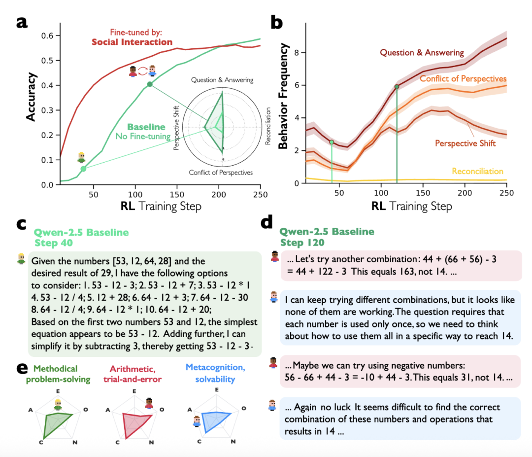 研究人员不提供任何对话结构的训练信号,只奖励模型答对题目的行为,结果发现模型会自发学会用对话式思考;