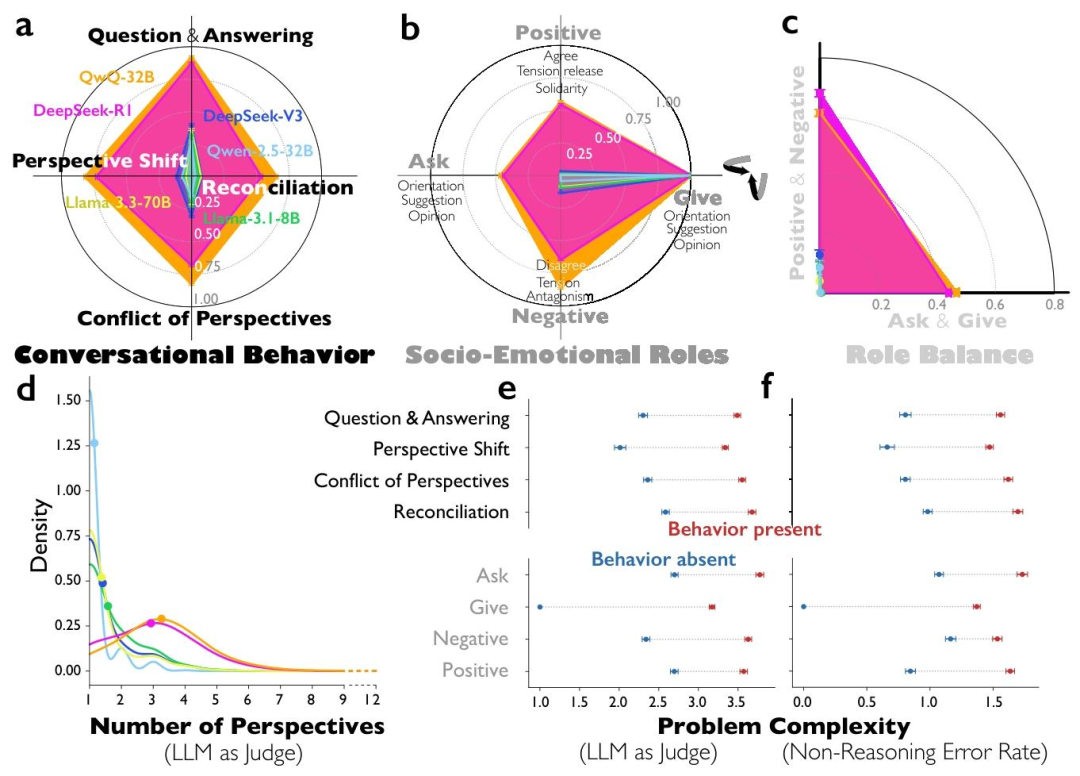 团队通过分析DeepSeek-R1和QwQ-32B等模型的思维轨迹发现,它们的推理过程充满了对话感。