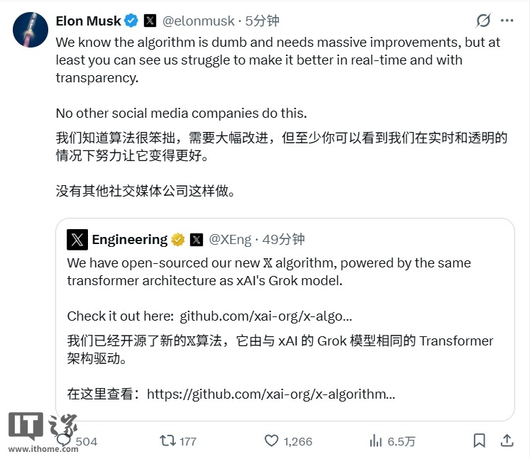 IT之家 1 月 20 日消息,埃隆 · 马斯克今日(1 月 20 日)宣布开源了新的 X 平台算法,该算法由与 xAI 的 Grok 模型相同的 Transformer 架构驱动。