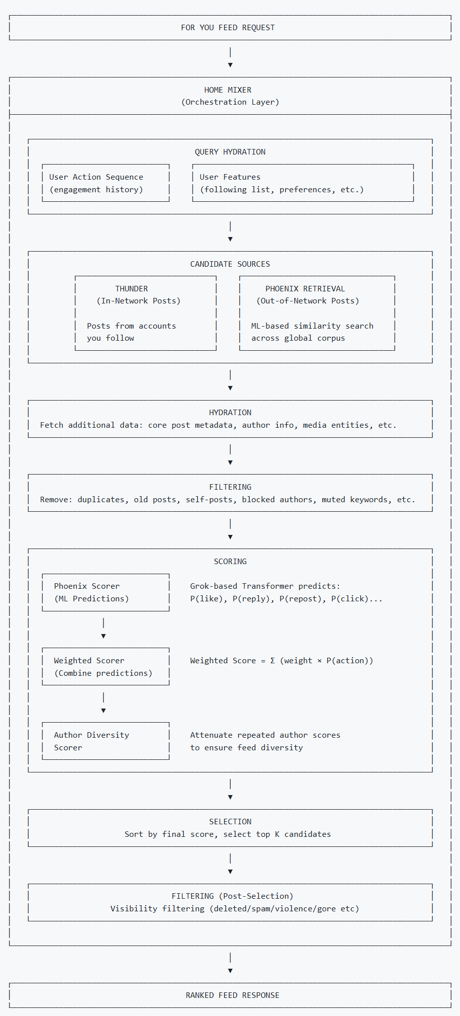 用户的推荐内容会结合关注账号的帖子与 X 上发现的帖子,然后使用基于 Grok 的转换器进行排序,该转换器预测用户可能喜欢、回复、转发、点击或观看的几率。