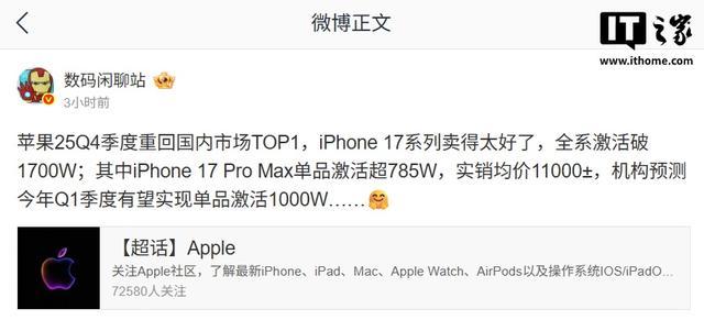 该博主还称,苹果 2025 年第四季度重回国内市场 TOP1,iPhone 17 系列卖得太好了,全系激活破 1700W;其中 iPhone 17 Pro Max 单品激活超 785W,实销均价 11000±,机构预测今年 Q1 季度有望实现单品激活 1000W。