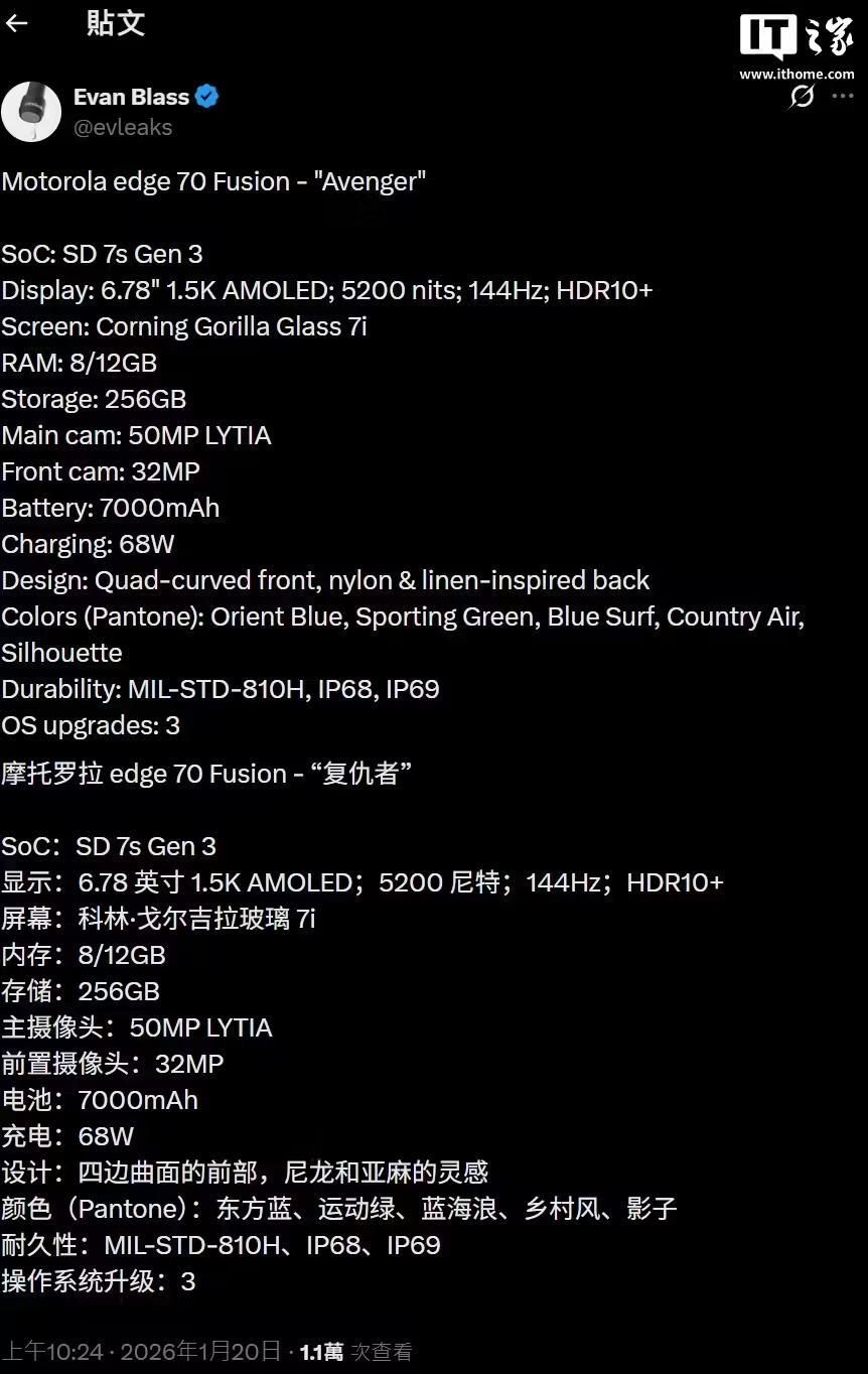 IT之家 1 月 20 日消息,消息人士 Evan Blass 今天在 X 平台发文,曝光摩托罗拉 Edge 70 Fusion 手机的详细配置。