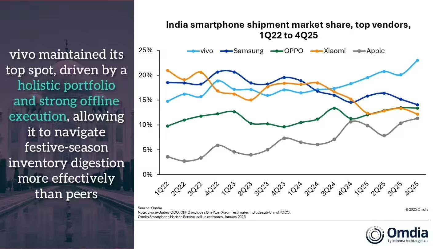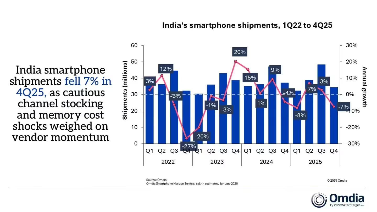IT之家 1 月 21 日消息,市场调查机构 Omdia 昨日(1 月 20 日)发布博文,报告称受存储芯片成本上涨、卢比贬值及需求疲软影响,2025 年第 4 季度印度智能手机出货量为 3450 万台,同比下降 7%;2025 全年出货量为 1.542 亿台,同比下降 1%。