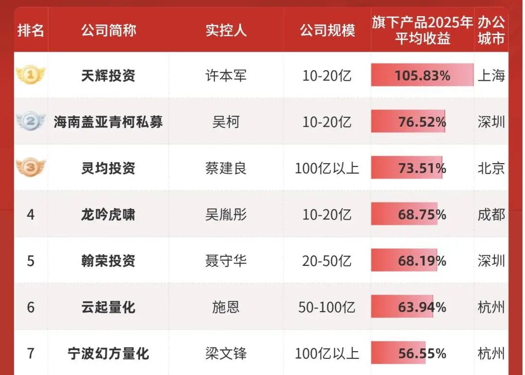 年度私募百强榜,按照公司平均收益排名,幻方量化位于第七名,百亿以上规模排名第二|图片来源:https://www.simuwang.com/news/285109.html
