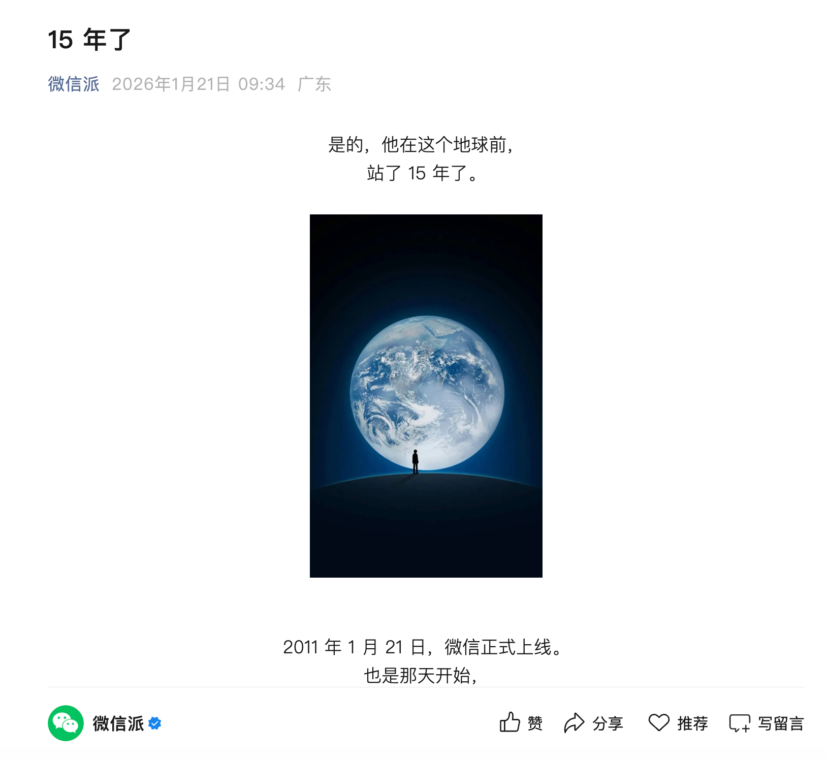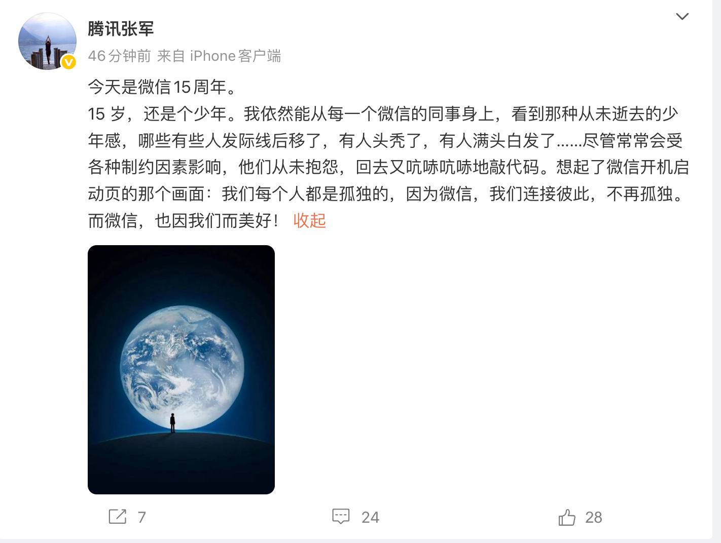 对此,腾讯公司公关总监张军发文称,“15岁,还是个少年。我依然能从每一个微信的同事身上,看到那种从未逝去的少年感,有些人发际线后移了,有人头秃了,有人满头白发了……尽管常常会受各种制约因素影响,他们从未抱怨,回去又吭哧吭哧地敲代码。想起了微信开机启动页的那个画面——我们每个人都是孤独的,因为微信,我们连接彼此,不再孤独。而微信,也因我们而美好。”