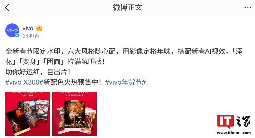 IT之家 1 月 21 日消息,vivo 官方今日宣布,将推出全新春节限定水印,提供六大风格可选,并支持新春 AI 视效「添花」「变身」「团圆」。