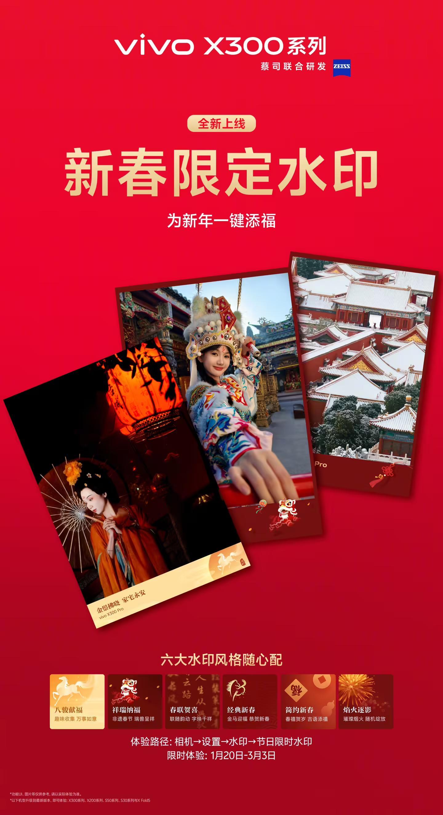 据介绍,vivo 新春限定水印提供六大风格,包括:八骏献福、祥瑞纳福、春联贺喜、经典新春、简约新春、烟火逐影(限时体验:1 月 20 日-3 月 3 日)。体验路径如下: