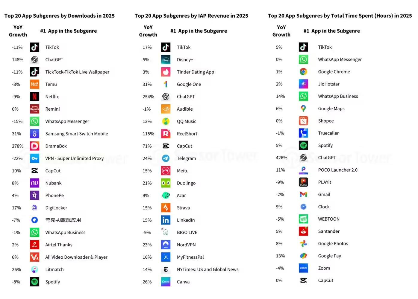 AI 应用是 2025 年增长最迅猛的领域。ChatGPT 的下载量激增 148%,内购收入增长 254%,总使用时长更是惊人地暴涨了 426%,跃升至全球应用下载榜第二位。