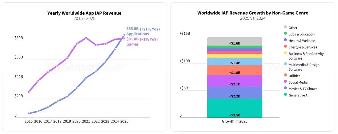 IT之家 1 月 22 日消息,Sensor Tower 发布《2026 移动应用市场报告》,揭示了 2025 年全球移动市场的重大转折:消费者在非游戏应用上的支出首次超越游戏。