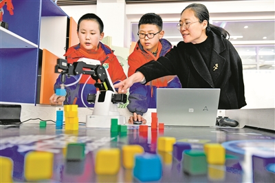 下图 在山东省日照市新营小学,牟娟老师指导学生使用人工智能机械臂。