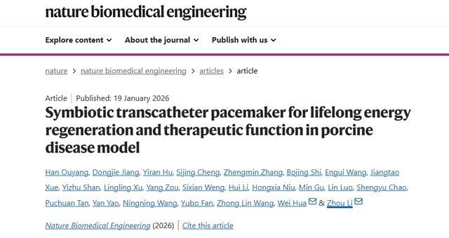相关研究成果以“共生型经导管起搏器在疾病模型中实现终身能量再生与治疗功能”为题,于 2026 年 1 月 19 日在《自然生物医学工程》(Nature Biomedical Engineering)上发表。