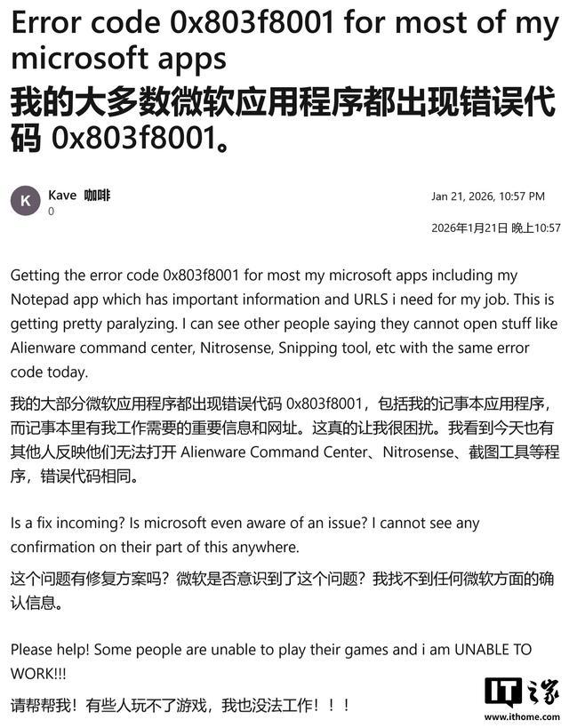 IT之家注:错误代码 0x803f8001 通常与微软商店(Microsoft Store)的后端机制有关,具体涉及商店缓存损坏、微软账户的临时同步问题,或应用程序启动时的许可证验证失败。
