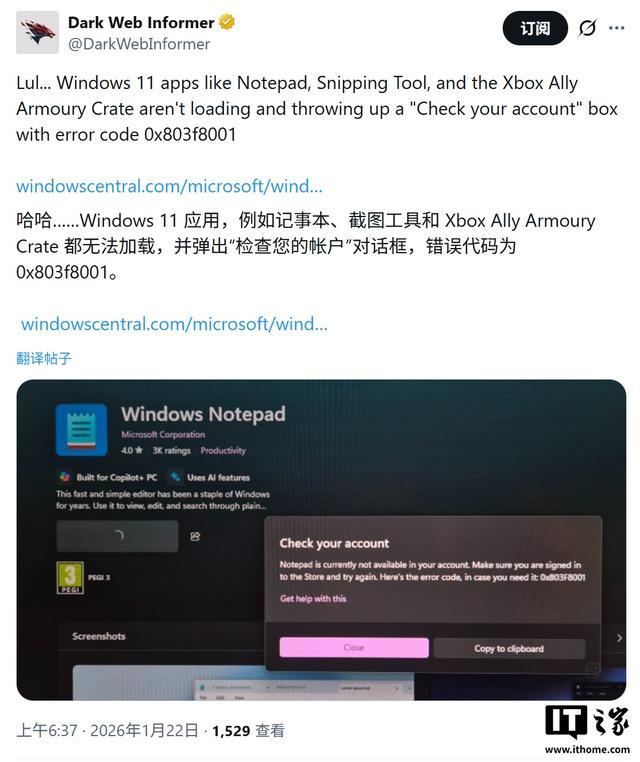 基于用户反馈,此次故障的波及范围不仅限于微软自家的第一方应用,还蔓延至硬件厂商的配套软件。受影响列表包括记事本和截图工具(Snipping Tool)等这类系统级基础工具,还包括华硕的 Armory Crate、戴尔外星人的 Alienware Command Center 以及宏碁的 NitroSense 等第三方控制中心。