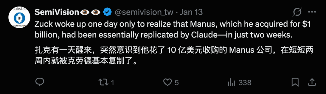 评论区的画风也很有意思,有人直接说「Meta 竟然在 Claude Cowork 发布前夕,买入了 Manus」。