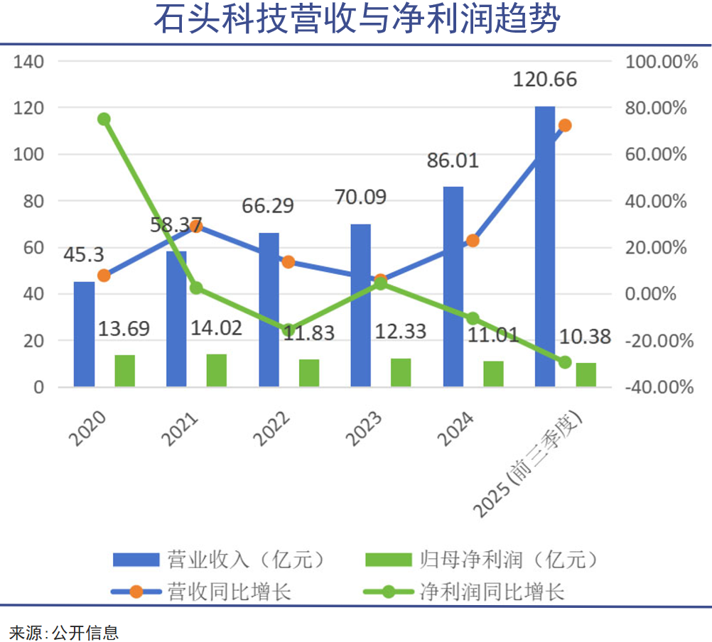 这个成就本足以让任何竞争对手侧目。然而翻开利润表,数字却并不好看。2025年前三季度,石头科技净利润同比下滑29.51%,仅为10.38亿元。自2020年起,石头科技的盈利状况就进入了下滑通道,这种营收与利润的背离,早已成了压在投资者心中的一块石头。