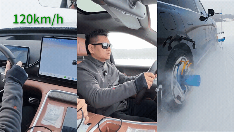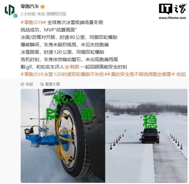 根据官方描述,零跑 D19 在冰面 / 沥青对开路,时速 80 公里,同侧双轮爆胎,爆破瞬间,车身未剧烈摇晃,未见失控跑偏;在冰雪路面,时速 120 公里,同侧双轮爆胎,危机时刻,车身依然稳如磐石,未出现跑偏甩尾。