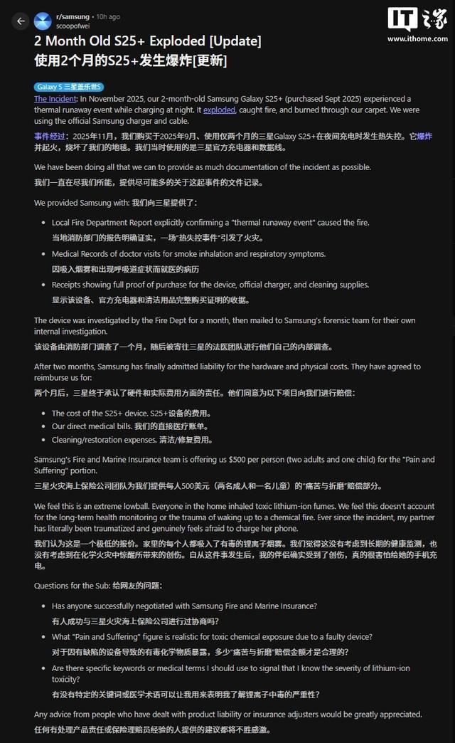 此外,三星火灾与海上保险团队还向该用户家庭提出每人 500 美元的赔偿方案,涵盖两名成人和一名儿童,这笔款项被定性为对事故造成的“痛苦与折磨”的补偿。但用户认为这一赔偿金额过低,理由是该金额未考虑到家庭成员吸入锂离子电池烟雾后可能需要的长期健康监测费用,也未涵盖他们被一场化学品火灾惊醒所遭受的心理创伤。帖子还提到,因该事故带来的心理阴影,家中一名成员如今甚至不敢给手机充电。