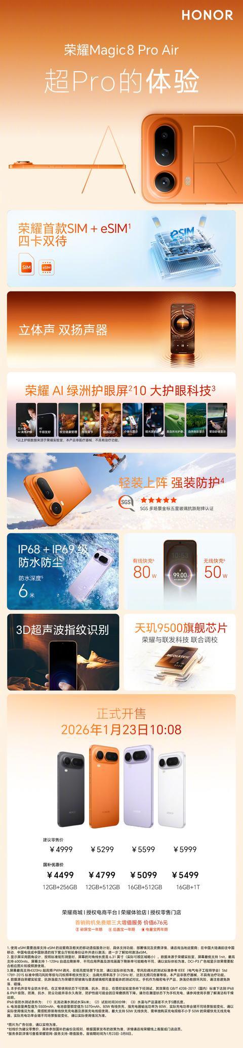 IT之家 1 月 23 日消息,荣耀 Magic8 Pro Air 手机今日 10:08 正式开售,首销购机赠价值 999 元尊享服务。该机搭载联发科天玑 9500 处理器并支持 eSIM 通信,售价 4999 元起。