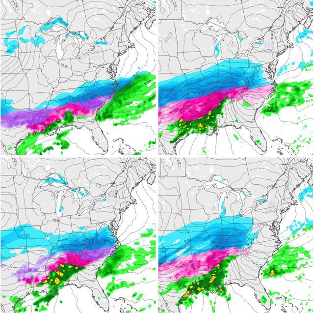 在上述风暴中,美国 GFS 模型和欧洲 ECMWF 模型给出的预报路径和强度存在明显差异:美国模型显示风暴将偏南运行,给美国南部带来冰冻降水;欧洲模型则给出更偏北、但强度较弱的方案。对纽约而言,前者意味着几乎无雪,后者则暗示周日可能出现降雪。