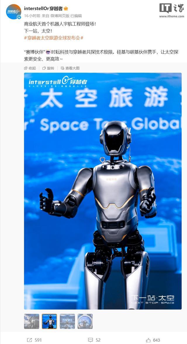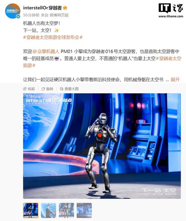 IT之家注意到,众擎 PM01 人形机器人成为穿越者 016 号太空游客,也是首批太空游客中唯一的硅基成员。
