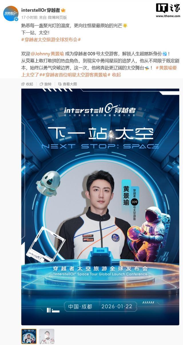 演员黄景瑜成为穿越者 009 号太空游客,黄景瑜在 VCR 中表示很荣幸成为一名太空旅客,将乘坐中国人自己的飞船亲身抵达那片星海。