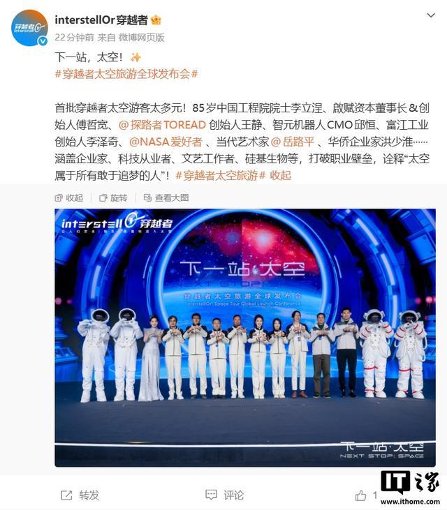 据穿越者此前消息,穿越者已开启船票预售,预售船票 300 万元 / 张,预付 10% 可锁定名额,目前已签约来自学界、商界、航天界、艺术界、娱乐界、网红界等领域的十余位付费太空游客。