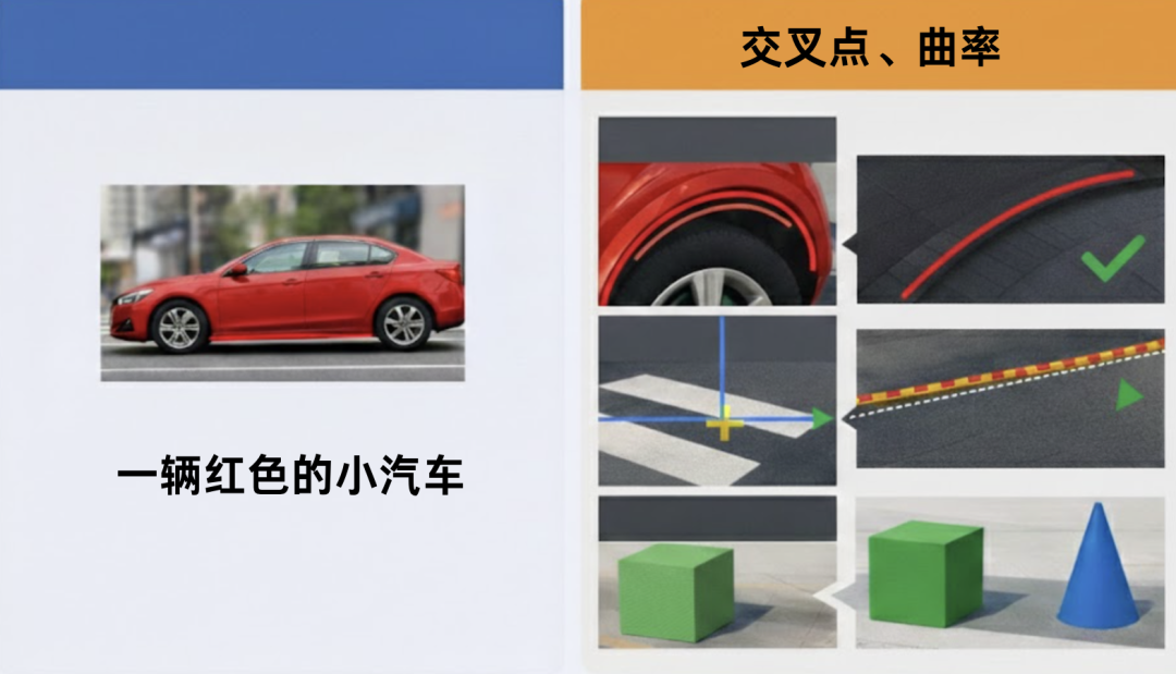 例如,图像中“一辆红色的汽车”可以被轻松转写为文字;但更细粒度的几何信息,如边界的精确曲率、交叉点的具体位置、相对空间关系的微小变化,却很难被语言忠实描述。