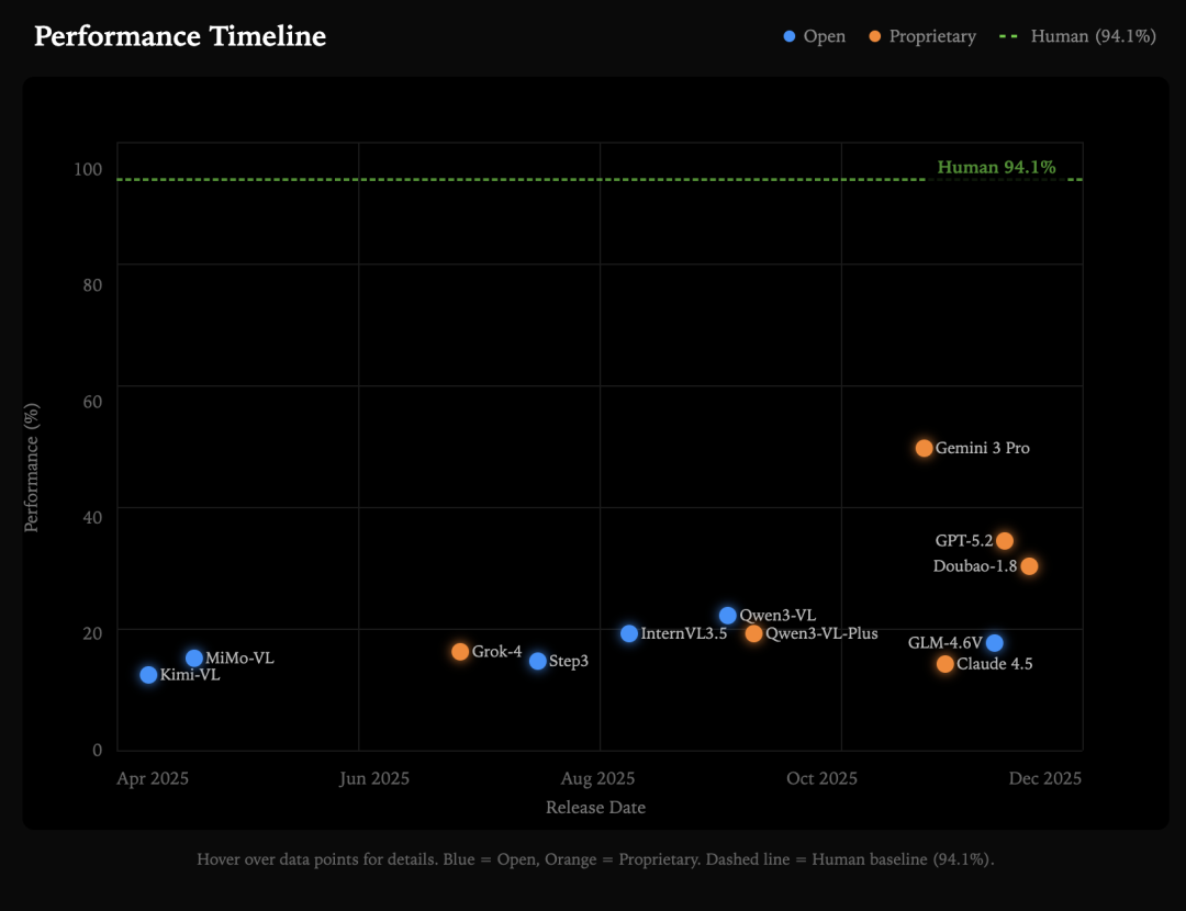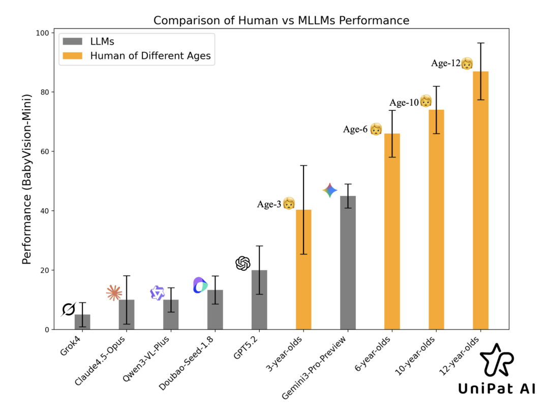 其他前沿模型,包括GPT-5.2、Claude 4.5 Opus、Grok-4等,整体表现甚至不如三岁小孩。