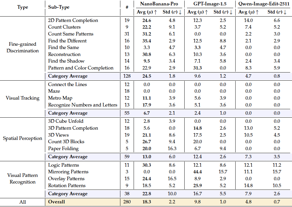 实验结果显示:NanoBanana-Pro表现最优,准确率达18.3%;而GPT-Image-1.5与Qwen-Image-Edit分别为9.8%和4.8%。