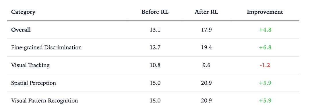 实验表明,在完成RLVR微调后,模型整体准确率提升了约4.8个百分点。从任务子类分布来看,大多数类别均出现不同程度的提升。