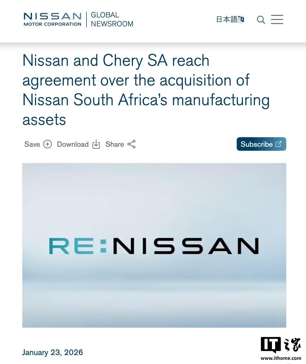 IT之家 1 月 23 日消息,当地时间 1 月 23 日(今天),日产与奇瑞南非公司已就日产位于南非罗斯林的制造资产出售事宜达成一致。