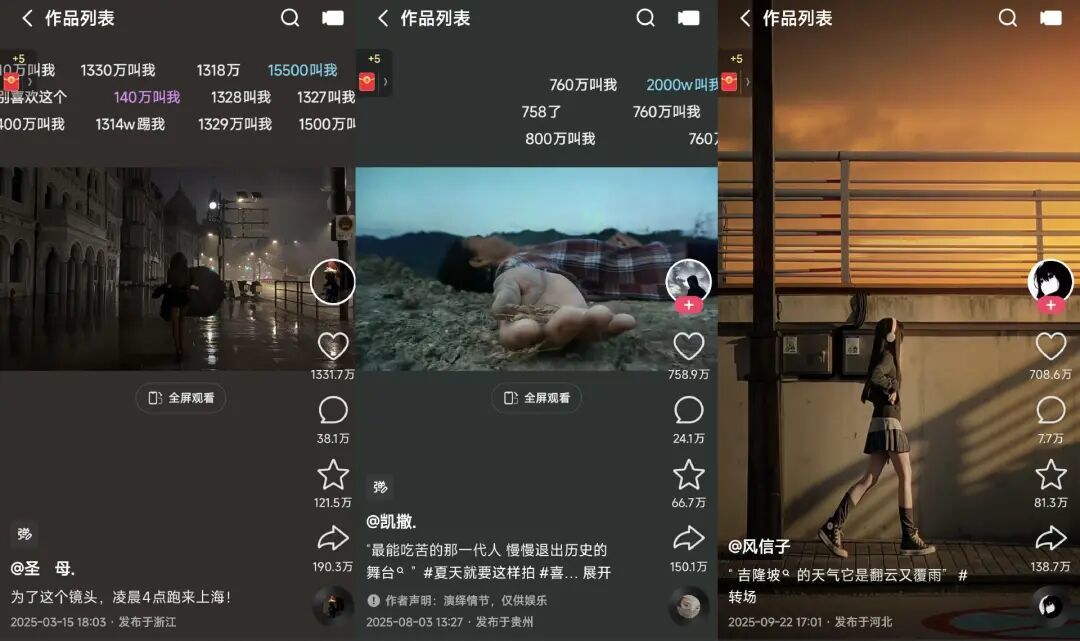 其中获赞数最高的是“刘敢敢”的一条氛围感转场视频。截至发稿前,该视频累计获赞2598万,转发数超523万。