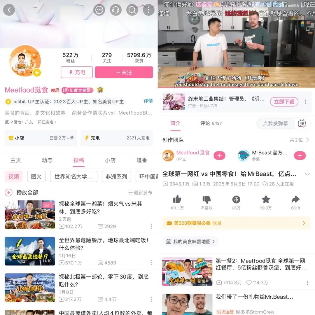 值得注意的是,美食UP主“Meetfood觅食”发布的视频中,有两条跻身2025B站播放量TOP10,其中一条是与“MrBeast野兽先生”的合拍视频,他让MrBeast挑战吃辣条、大白兔等中国特色食物,视频播放超3334万。