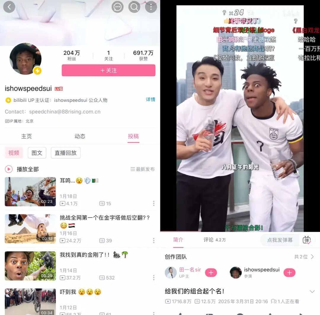 过去一年,“甲亢哥”的B站账号“ishowspeedsui”涨粉201万,截至目前,其发布的第一条与“田一名sir”合唱《热爱105℃的你》的视频热度最高,在B站的播放量超1716万。