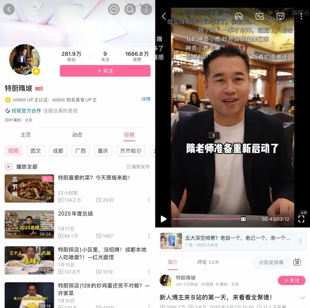 “特厨隋坡”位居2025B站涨粉榜第三,一年涨粉超279万。隋坡原本是头部美食探店博主,因与MCN存在纠纷,原账号“特厨隋卞”停更,转而在新账号“特厨隋坡”中继续分享探店美食。