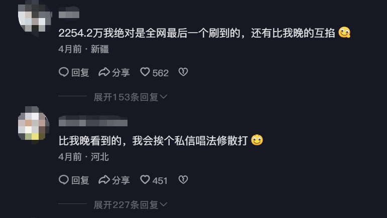 第一阶段,吸引对视频内容感兴趣的精准人群,评论大多和视频内容相关;第二阶段,吸引对爆红视频感兴趣的围观群众,评论区大多是类似“我绝对是全网最后一个刷到的”打卡式评论。此时,爆款视频成为了一种名为“亲手制造一个大爆款”的群体行为艺术。