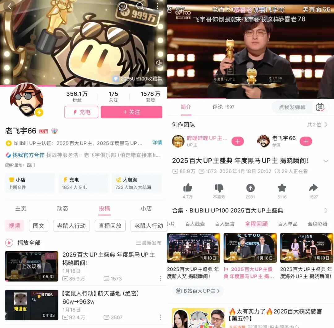 “老飞宇66”被称为《三角洲行动》赛道的“一哥”,他凭借各种加入鼠鼠表情包的抽象游戏视频走红,位居2025B站涨粉榜第四,一年涨粉超264万。他也因此入选B站百大,成为2025年度黑马UP主。