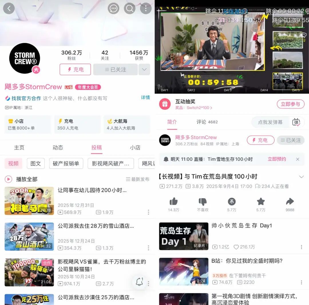 2025年8月,Tim在“飓多多StormCrew”账号上的100小时荒岛直播获得了全网关注,全平台累计观看人次超2亿,这场100小时的直播回放目前在B站的播放量达271万。