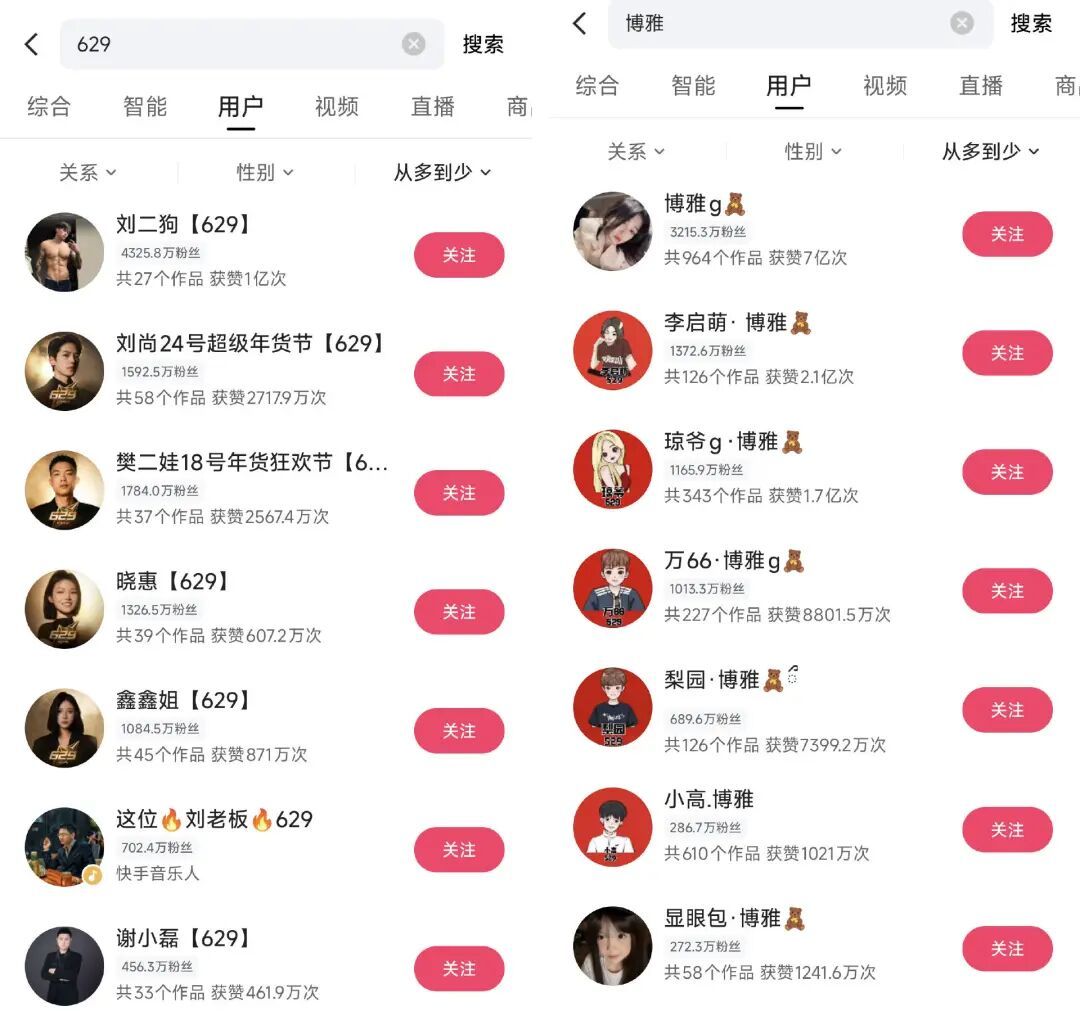 “刘二狗【629】”虽已被平台封禁,但过去一年自身涨粉超1316万,并捧出了“晓惠【629】”“刘尚【629】”“樊二娃【629】”等多个账号,其中“晓惠【629】”一年涨粉超1037万。