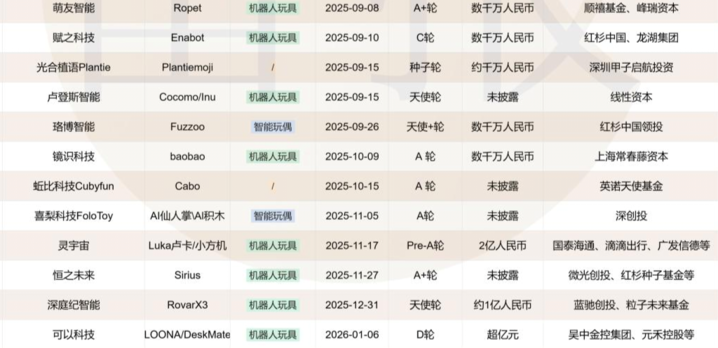 资本市场也用真金白银为这场浪潮投下了信任票。据不完全统计,自2024年至今,国内机器人玩具赛道已至少有52起投融资事件,其中2025年占33起,同比增加了83%。