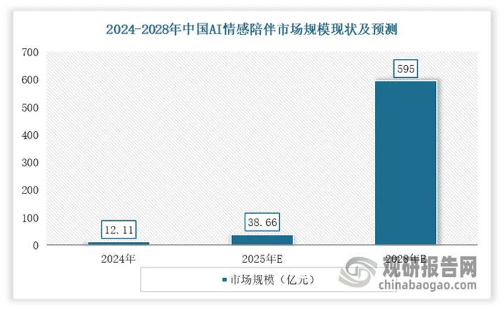 中研普华产业研究院数据显示,2025年中国AI情感陪伴市场将爆发至38.66亿元,预计2028年将突破595亿元,年复合增长率达148.74%。