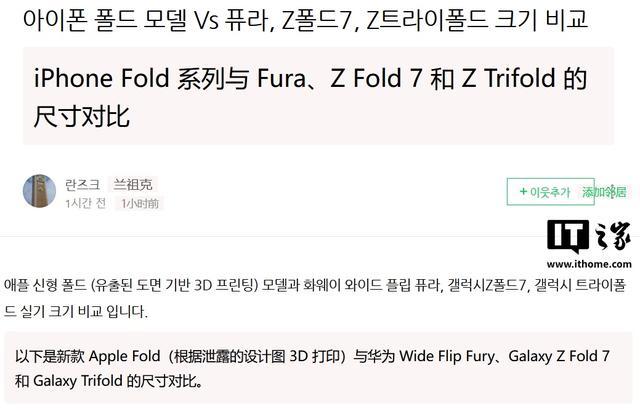 IT之家 1 月 24 日消息,消息源 yeux1122 今天(1 月 24 日)发布博文,分享了一组图片,展示了苹果首款折叠 iPhone Fold 的尺寸,并对比了华为阔折叠 Pura X、三星 Galaxy Z Fold7、三星 Galaxy Z Trifold 手机。