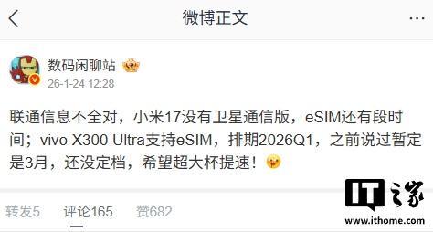 微博博主 @数码闲聊站 对此表示,小米 17 没有卫星通信版,但后续将提供 eSIM 支持;vivo X300 Ultra 同样支持 eSIM,虽然具体发布日期未定,但确认会在今年第一季度内发布。
