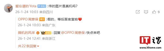IT之家 1 月 25 日消息,OPPO Find 系列产品负责人周意保近日接连两次回应了网友 Find X9 Ultra 手机渲染图的真伪,他直言是假的,可以等后面官宣。