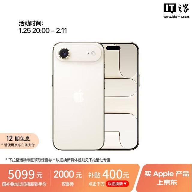 继天猫后,目前 Apple 产品京东自营旗舰店 iPhone Air 也迎来促销,叠加 2000 元券、国补和以旧换新补贴后到手价低至 5099 元,同时支持京东白条 12 期免息。目前,用户已可以在京东相应商品卡中下拉领取 2000 元券,1 月 25 日 20:00 起直接下单即可。