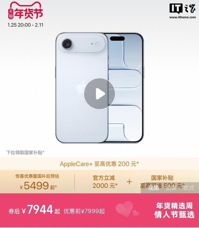 苹果 Apple Store 天猫旗舰店显示,苹果 iPhone Air 手机将于“天猫年货节(1 月 25 日 20:00 至 2 月 11 日)”期间进行促销,该机国行原价 7999 元起,活动期间可领 2000 元券,叠加部分地区 500 元国补后,到手价低至 5499 元(IT之家注:限量 13000 台)。