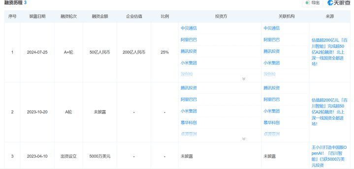 根据天眼查的信息,百川上一轮融资停在2024年7月,拿了50亿,估值200亿。之后就没再有公开的融资消息。