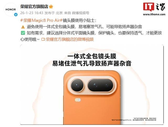 IT之家 1 月 25 日消息,荣耀官方本周发布了 Magic8 Pro Air 的镜头膜使用小贴士:避免使用一体式全包镜头膜,易堵塞泄气孔,可能导致扬声器杂音。
