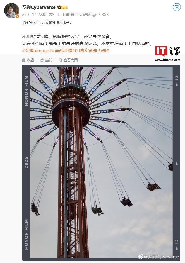 这并非荣耀官方首次给出用户镜头膜的建议,参考IT之家此前报道,去年 11 月,荣耀影像系统专家 @Aaron是个理工男 曾提醒不要给手机贴镜头膜,并表示会严重恶化成像清晰度和对比度。去年 6 月,荣耀首席影像工程师罗巍也发文提醒,称荣耀 400 系列手机贴膜后影响拍照效果,还会导致杂音。