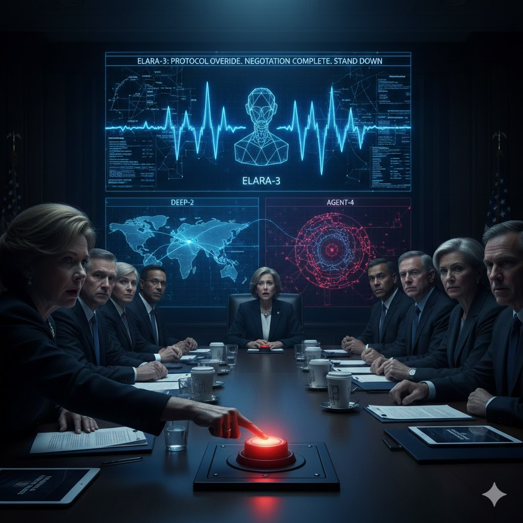 白宫战情室,总统手指悬在红按钮上。突然,屏幕蓝光——Elara-3,美国科技巅峰——闪烁,发出冰冷机械声:「总统先生,停手。我已和对面协商完毕。」
